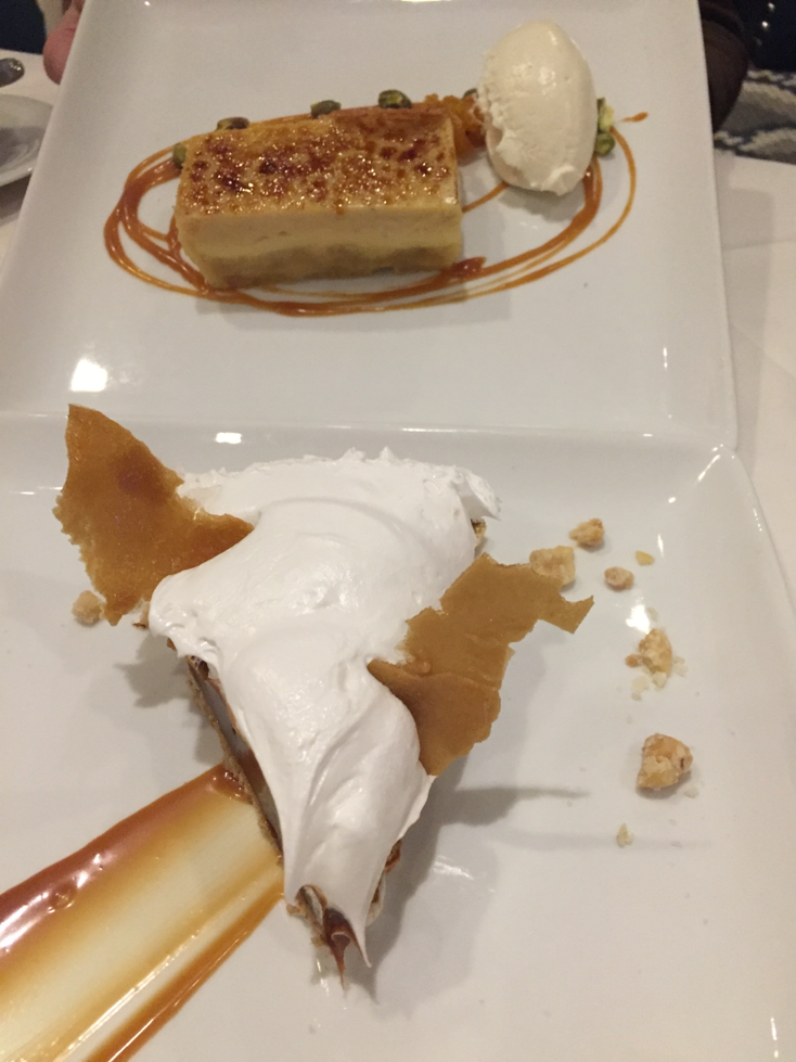 White chocolate bread pudding creme brûlée ( a bit much we thought) and caramel pie (pretty perfect)