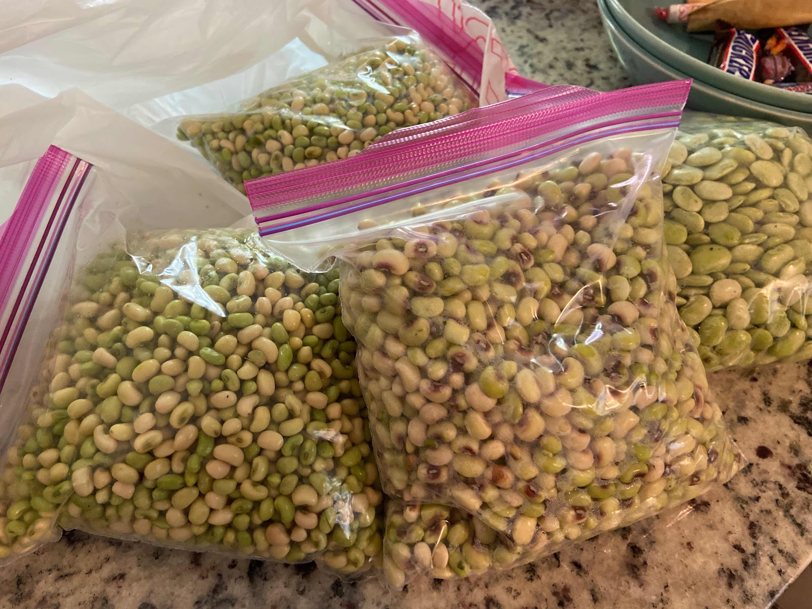 Freshway was stocked up on peas so I bought plenty. Also eggplant, squash, corn, tiny potatoes, okra, tomatoes and more. I may have over done it. Better get cooking.