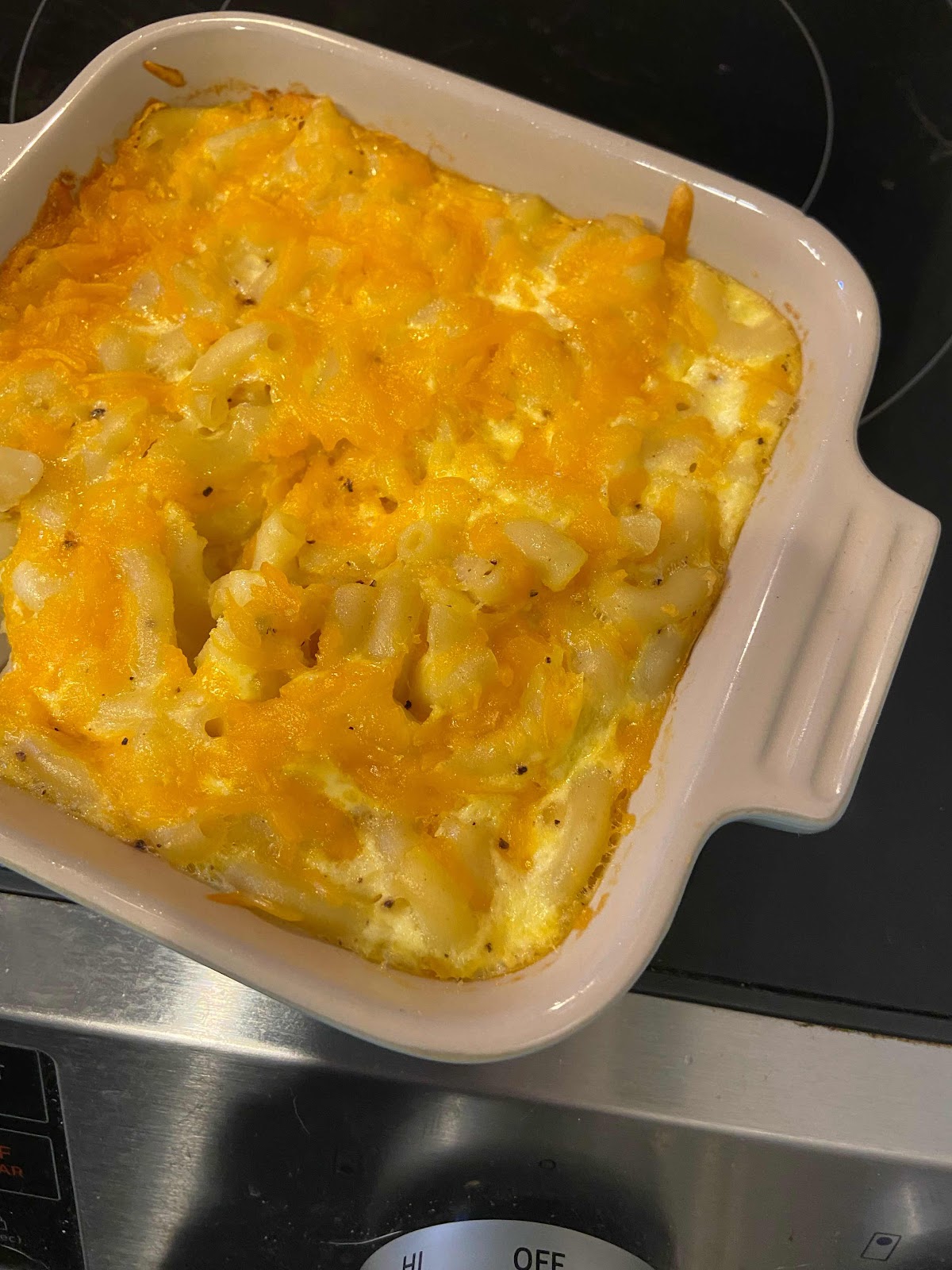 Cook the mac. Mix in cheese. Pour egg and milk mixture over. Cheese on top. Bake until set.