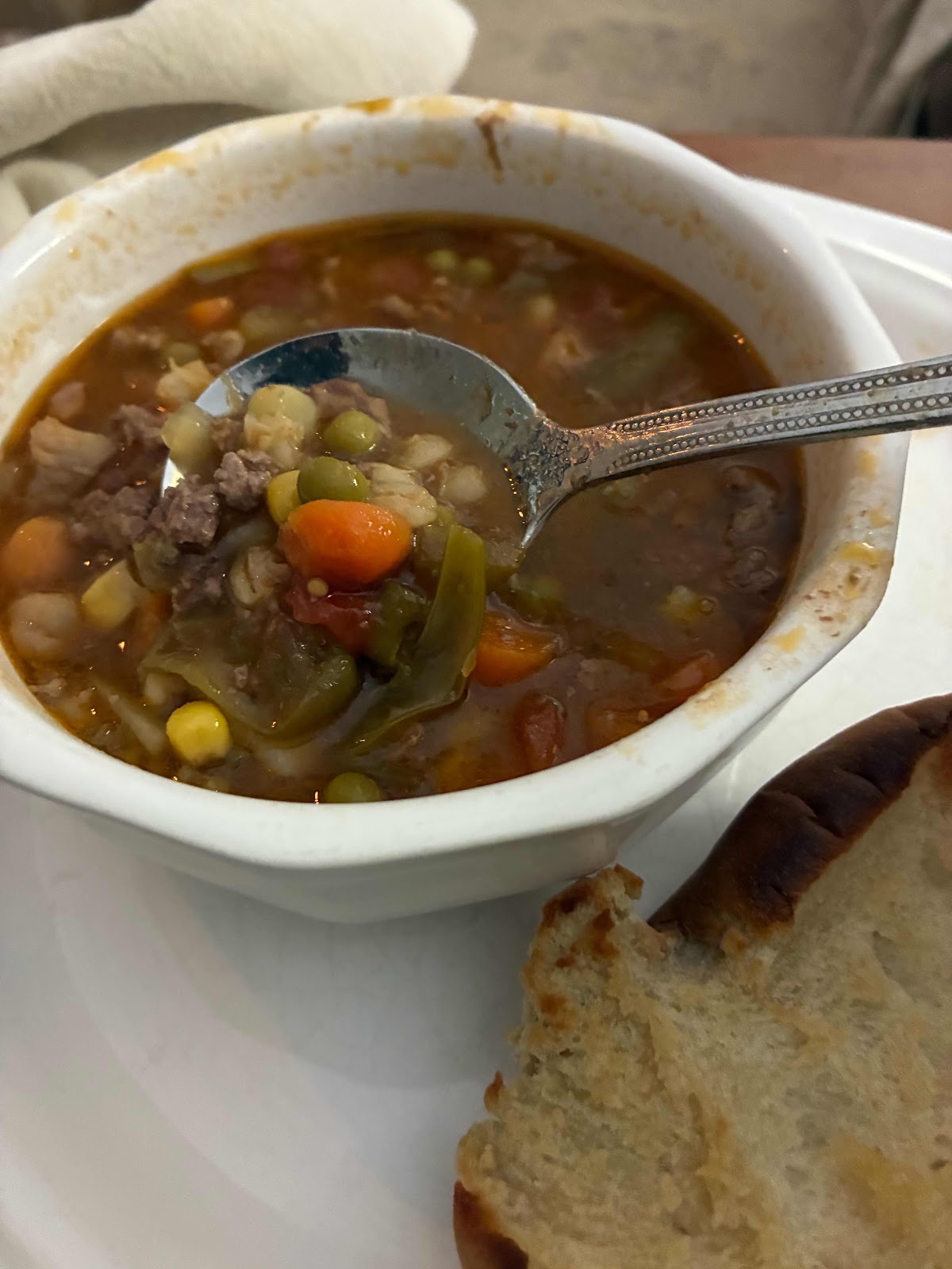It’s ancestors were broth from corned beef brisket, chuck roast liquid and remains from Swiss steak gravy. When you start like that you are already headed down flavor road. Leftover veggies from freezer, barley and a browned in the pot round steak left a great flavor.
