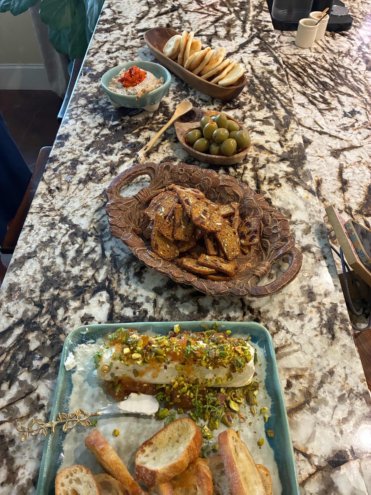 That is purple hull pea hummus in the back there. Whipped goat cheese with fig preserves and pistachios in front.